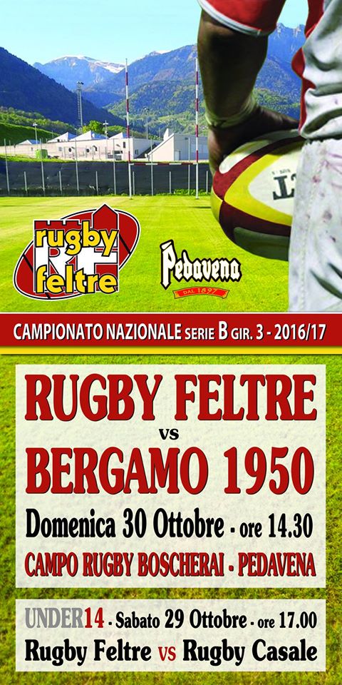 serie B - domenica 30 ore 14.30 - RUGBY FELTRE - RUGBY BERGAMO: partita importante per capitan Gaso e compagni, che attendono l'altra neopromossa del girone, il Rugby Bergamo. Avversari che ci precedono di un punto in classifica. Serve il massimo del supporto possibile per sostenere la nostra squadra. Direzione arbitrale affidata a Dario Merli di Jesi.