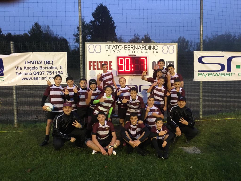 under 14 - RUGBY FELTRE - JUNIOR PIAZZOLA 90-7: altra bella prestazione della nostra quattordici, che continua a impressionare. Nonostante la pioggia, i ragazzi di capitan Aspodello hanno messo in campo una robusta prestazione, fatta di concretezza e grossa pressione difensiva. Tanti palloni, infatti, sono stati utilizzati proprio dal recupero. Alla fine del primo tempo il match era già chiuso nel punteggio, spazio quindi ai cambi, che hanno consentito di aumentare l'esperienza dei ragazzi meno esperti, ma sempre presenti ed entusiasti agli allenamenti. Il Piazzola ha continuato a giocare a testa alta e ha anche ottenuto una marcatura sugli sviluppi di un interessante gioco al piede. Le nostre mete sono state quattordici e gli autori sono: Aspodello, Zabot, Garlet, De Cet, Sangiorgi e De Donà . Le dieci trasformazioni portano le firme di Aspodello e Zabot.