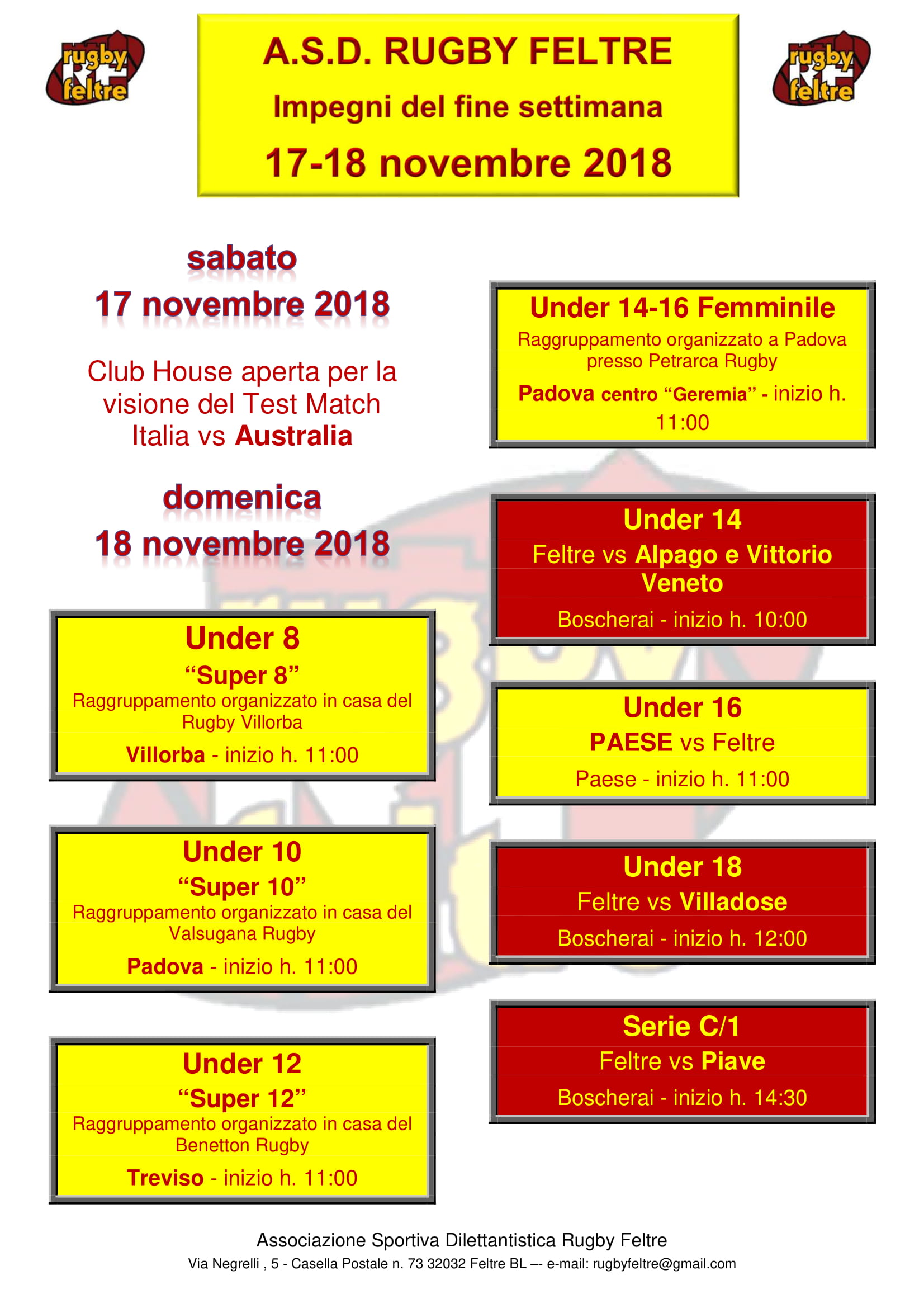 under 16 - domenica 18 novembre ore 11.00 - RUGBY PAESE - RUGBY FELTRE: interessantissima trasferta per l'under 16, che gioca sul campo dei Canguri. Gara che si annuncia ovviamente complicata, perché il Paese da sempre ha un settore giovanile tra i migliori in Veneto, ma la nostra sedici è in crescita, nonostante anche in questo caso si venga dall'interruzione dovuta al maltempo e alle selezioni.