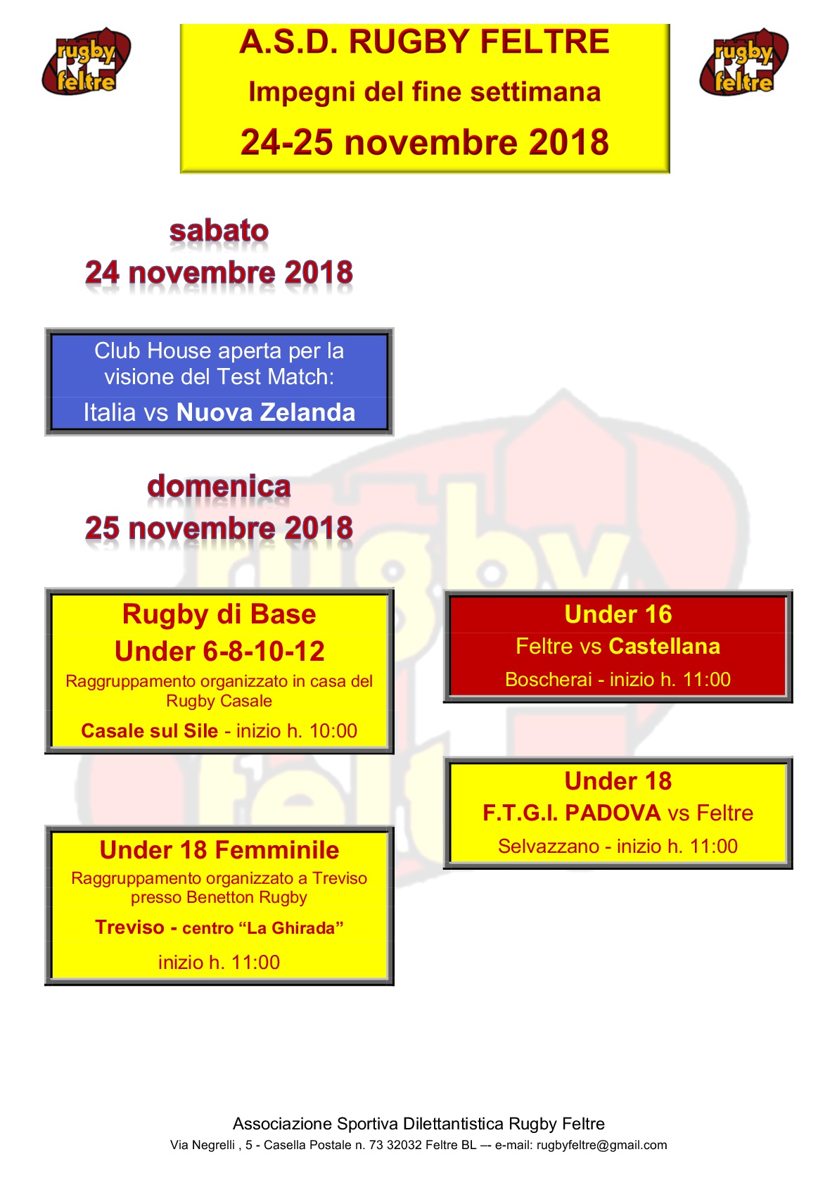 under 16 - domenica 25 novembre ore 11.00 - RUGBY FELTRE - CASTELLANA: altra partita bella tosta per la nostra under 16, alla ricerca della prima vittoria, dopo averla sfiorata in questo avvio di campionato. La squadra di Castelfranco è forte, occupa la seconda posizione e, quindi, bisognerà fornire una prova eccellente per venirne a capo, ma Aspodello e compagni hanno tutte le qualità per poterlo fare.