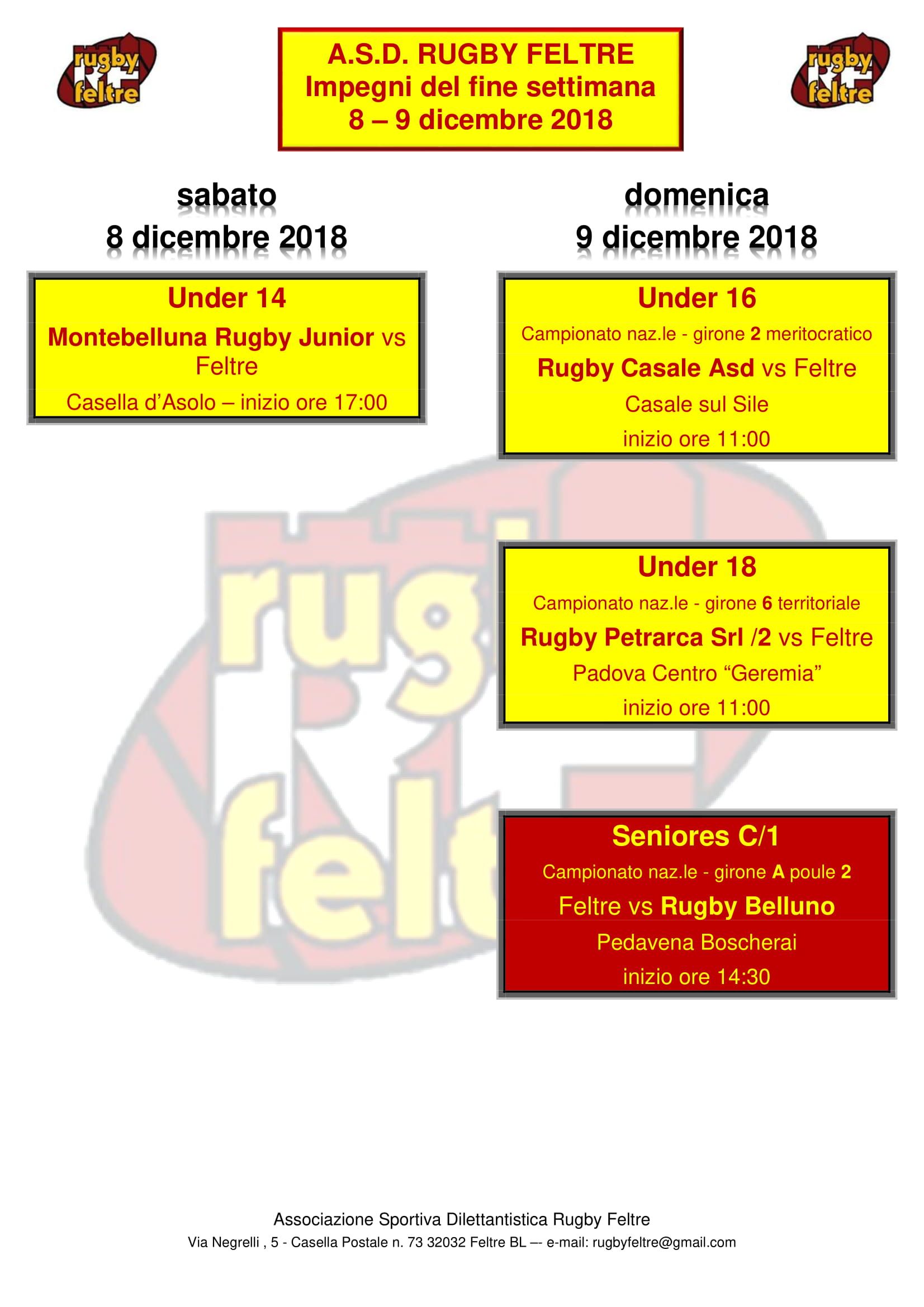 under 18 - domenica 9 dicembre ore 11.00 - PETRARCA PADOVA/2 - RUGBY FELTRE: al Memo Geremia cerchiamo la settima vittoria consecutiva, per continuare un avvio di stagione strepitoso. Guai a sottovalutare l'impegno, ma i ragazzi anche con il Riviera hanno dimostrato di interpretare al meglio le partite. Arbitro del match è Stefano Traversi.