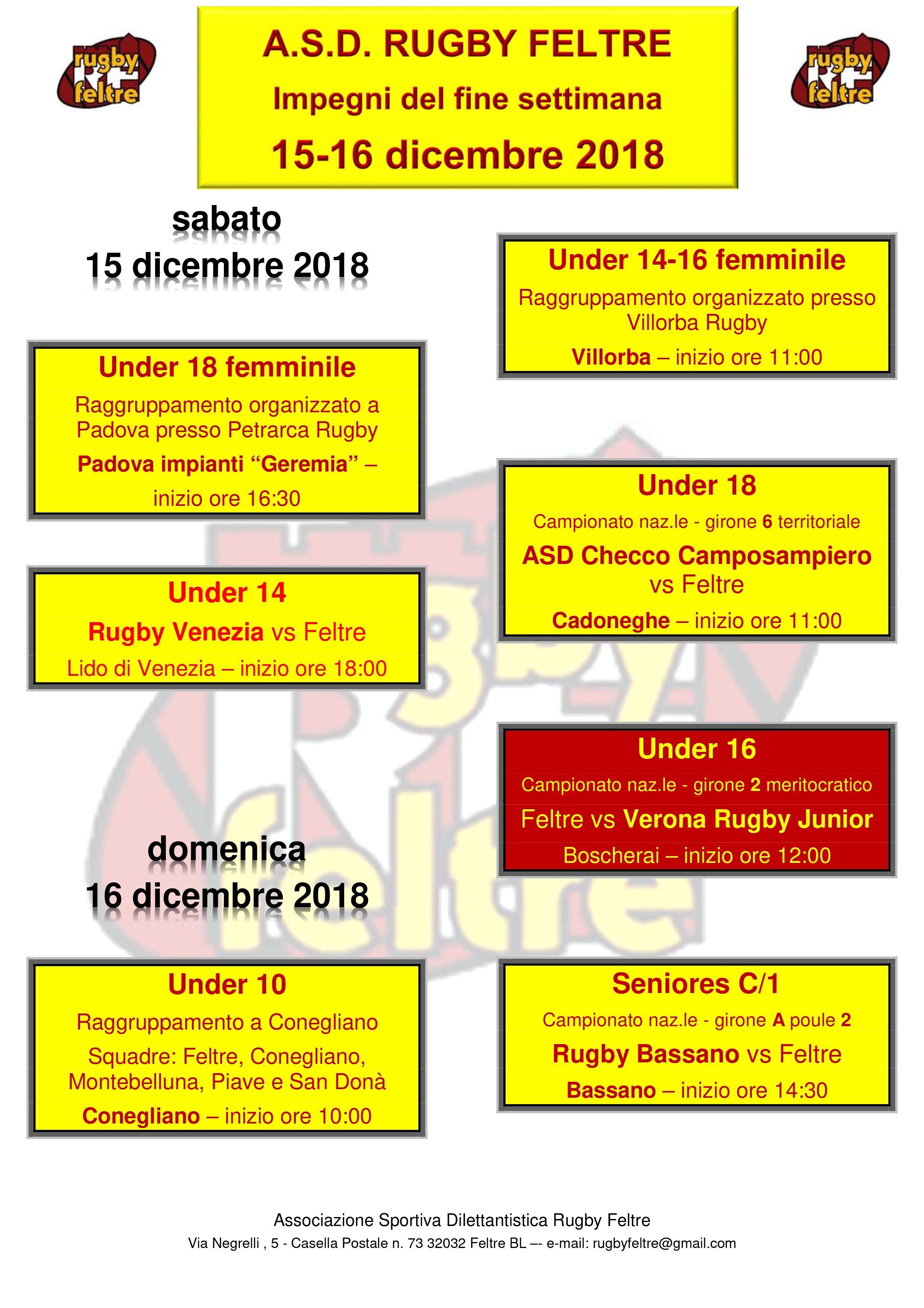 under 16 - domenica 16 dicembre ore 12.00 - RUGBY FELTRE - VERONA RUGBY JUNIOR: match difficile per l'under 16, che affronta la capolista. L'obiettivo della sedici è di esprimersi con continuità per tutto l'arco della partita, perché i ragazzi hanno le capacità e sono allenati per poterlo fare. Sarà Carlo Covini ad arbitrare la partita con gli scaligeri.